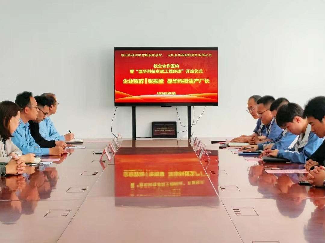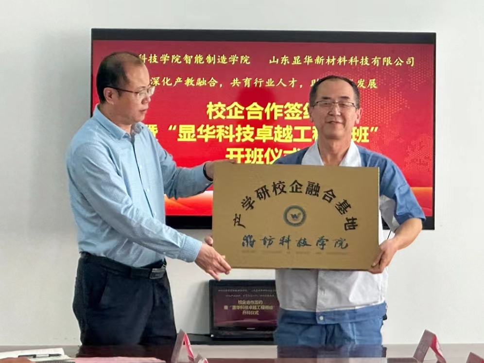 为深化产教融合,提高人才培养质量,共同推动高端智能装备领域的人才培养和技术创新,促进教育链、人才链与产业链、创新链有机衔接。4月29日,智能制造学院与山东显华新材料科技有限公司(以下简称“显华科技”)举行校企合作签约仪式暨“显华科技卓越工程班”开班仪式。