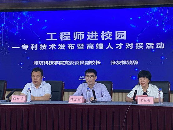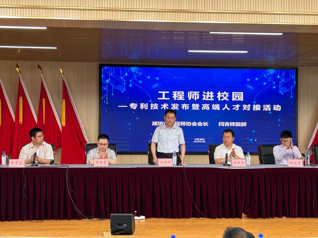 5月18日,由寿光市科学技术协会、寿光市市场监督管理局指导,我校联合潍坊市工程师协会、潍坊市知识产权运营中心承办的工程师进校园—专利技术发布暨高端人才对接活动在学校办公楼六楼会议室举行。寿光市科协党组书记、主席刘培杰,潍坊市工程师协会会长闫吉祥,潍坊市工程师协会秘书长周国勇,我校党委委员、副校长张友祥,科研处处长牛志宁,社会服务处副处长李守金,化工与环境学院院长宋继梅,副院长刘芳芳,博士技术服务团队成员,各企业代表以及学生代表参加活动,宋继梅主持。