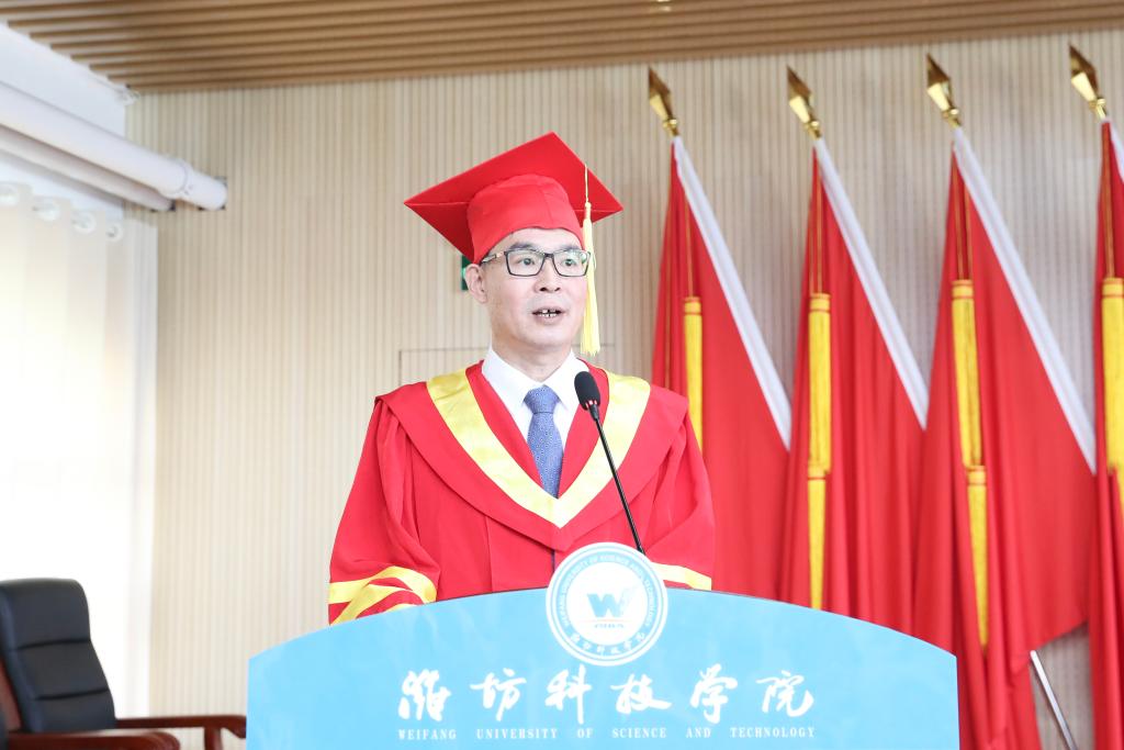典礼在国歌激昂的旋律中拉开序幕,魏华中校长首先感谢东北师范大学对潍坊科技学院发展的关心关注,特别感谢东北师范大学经济与管理学院对乡村振兴产学研实训基地建设的倾力支持,同时祝贺首届18位MBA毕业生并致敬导师团队。他强调,学校在建校四十周年之际,获批山东省硕士学位授予立项建设单位,标志着我校研究生教育的重要进展。乡村振兴产学研实训基地成功录取了三级86名MBA学生,对区域经济发展产生了积极影响,成为寿光地区培养高级管理人才的“亮丽名片”。他鼓励毕业生以小事为起点,培养良好习惯,保持积极心态面对挑战,并视毕业为新起点,携带师长和学校的祝福,勇敢开启未来旅程,创造辉煌人生。