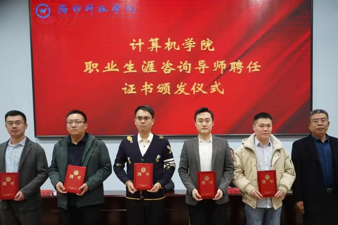为强化大学生职业生涯发展教育和就业指导服务,助力学生成长成才,助推高质量充分就业,12月11日,计算机学院在经管报告厅举行“‘码’动未来”·大学生职业生涯咨询工作室揭牌暨工作室导师聘任仪式。招生就业处处长杨志勇,鸢都就业创业指导团副秘书长兼就业与职业生涯规划专委会主任、山东产学优才教育科技有限公司总经理王晓伟,计算机学院党委书记张治海、副院长房玮参加仪式。仪式由党委副书记冯川主持。