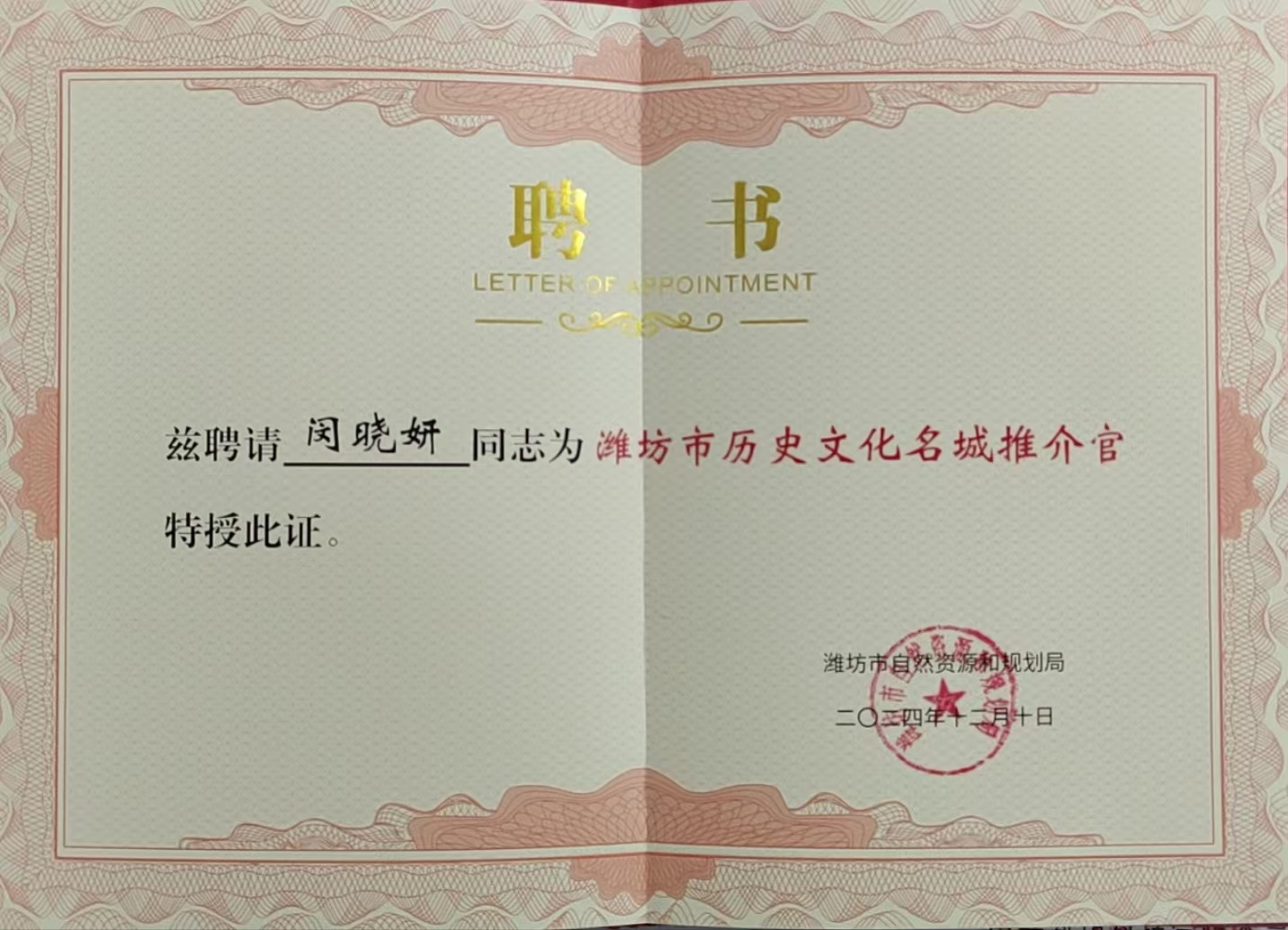 获聘“推介官”更是意义非凡,这标志着我校教师深度融入潍坊市历史文化名城建设进程。后续,老师们将带着这份荣誉与责任,继续在教学中传递地方文化精髓,助力教师成长,同时为潍坊历史文化宣传添砖加瓦,让更多人领略潍坊名城风采。